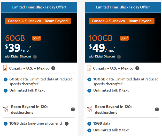美加墨漫游,250GB数据+一次性送35GB全球漫游数据,月费79加元;点击进入订购页面、黑五活动区。