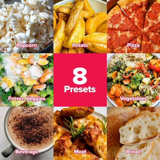 这款不锈钢微波炉容量高达1.1立方英尺,1000瓦功率,一键式自动烹饪,让您轻松烹饪微波炉食品,如爆米花、烤土豆、披萨、饮料和冷冻食品,而其再加热按钮则可轻松加热食物。软触式电子控制面板,配备按重量烹饪和按重量解冻选项,可在解冻和静置时间之间切换的快速解冻功能。安全锁可防止儿童在无人看管的情况下操作。