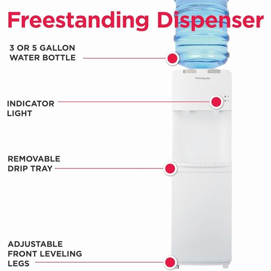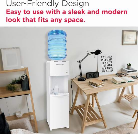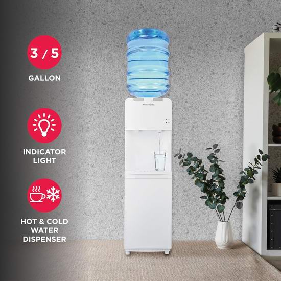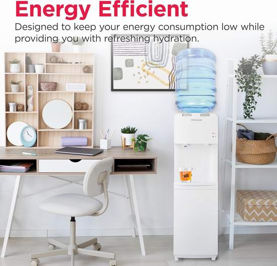 这款饮水机采用独立式、纤薄节省空间的设计,时尚的外观适合各种场所,兼容3和5加仑的桶装纯净水,可以轻松观察水位,及时补充水源。用户可根据需要选择冷水或热水,满足凉爽饮品或制作茶、咖啡、热可可等热饮的需求。内置儿童安全锁,防止意外溢出。
