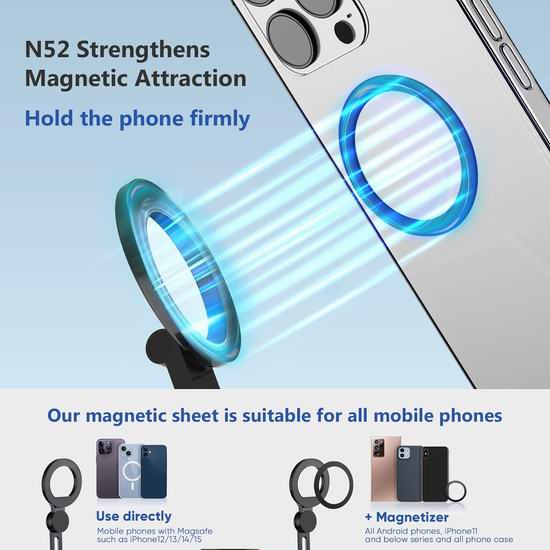 内置强力钢磁片,牢固固定手机。支架和关节由机械性能优良的锌合金制成,保证高强度的灵活伸缩能力。外部覆盖安全亲肤硅胶材质,佩戴舒适,长时间使用也无负担。对于非磁性手机,附赠的磁片可固定手机背面或手机壳背面即可使用。