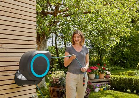 采用RollControl技术实现平稳收放与自动锁定,其180度旋转支架可有效防止软管缠绕,并随附喷嘴、连接软管等配件,整体采用防紫外线材质,便于庭院浇水的收纳与使用。