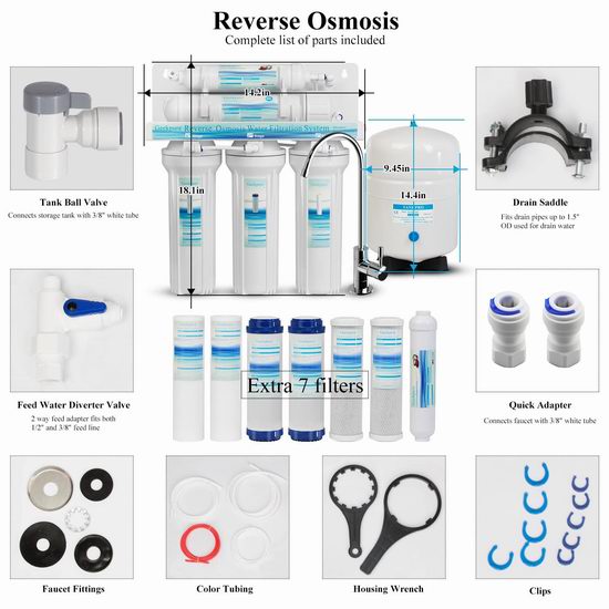 这款纯净水系统采用先进的RO反渗透膜分离系统,RO反渗透滤芯精度高达0.0001微米(头发直径约50微米),可以有效过滤水中99%以上的杂质、砷、铅、氟化物、镉、重金属、细菌、病毒、氯胺、除草剂、杀虫剂、胶体、有机物等污染物,产品通过反渗透滤水的NSF认证,5级过滤,包括PP棉,颗粒活性炭,压缩活性炭,RO反渗透膜,后置活性炭。额外再送7个滤芯,加上自带的5个滤芯,足够使用2年。配备条理清晰的安装说明,可轻松DIY安装,无需专业人士。