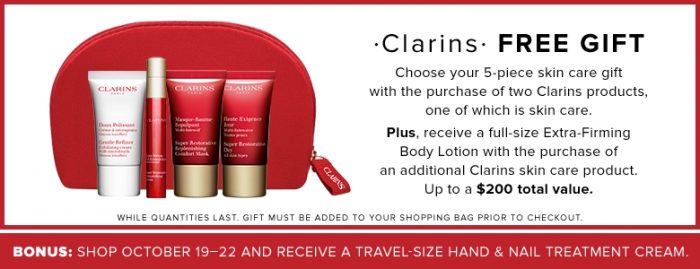 The Bay网店销售,买两件Clarins 娇韵诗护肤产品(其中一件必须是护肤品)送 5件套大礼包,再买1件护肤品,额外再送正装新生紧肤身体霜,礼包总价高达200元,使用折扣码:SUPER 全场享受9折优惠,满49元包邮。点击进入订购页面。