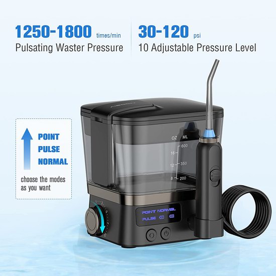 10级水压调节(30-120 PSI),每分钟产生1250-1800次脉冲式喷水,快速清洁口腔系统,可有效减少口臭、龋齿、牙痛和牙菌斑,并快速去除牙周细菌。配备600ml大容量水箱,6个多功能牙线喷嘴,其中包含3个不同颜色标准喷嘴,可供3人使用,轻巧易操控,成人儿童都可以使用。内置锂电池,充电5小时,可持续使用14天。