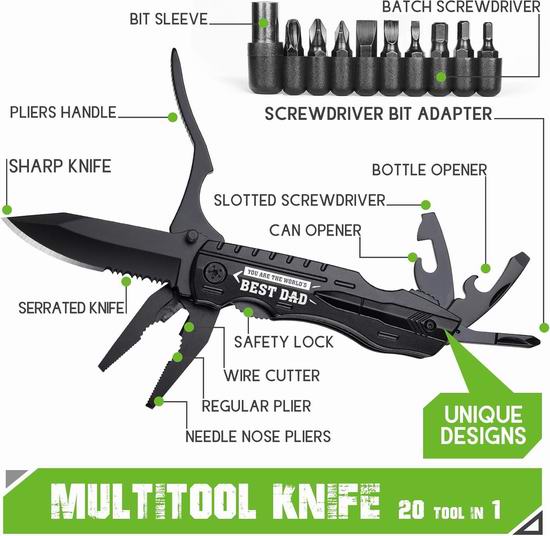 这款多功能工具包含钳子、开瓶器、开罐器、一字螺丝刀和9个可互换的螺丝刀头,适合DIY、家居维修和户外活动。防滑人体工学手柄和尼龙套,方便携带。拥有20种可靠的功能,设计紧凑,采用坚固耐用的不锈钢材质,使用寿命更长。