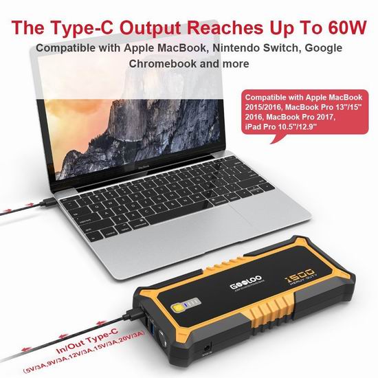 电瓶搭线不求人,峰值电流高达1500A。外形美观便携,19800mAh容量,一次充电可为8L以内汽油发动机或6.5L以内柴油发动机启动30次,平时用作充电宝为手机、平板电脑或GPS等设备充电,2个USB输出,实现快速充电,包含Type-C输出,功率高达60W,支持MacBook笔记本电脑,还可作为Nintendo Switch游戏机、Chromebook等笔记本电脑的临时电源。内置LED手电筒,具有照明/ SOS /频闪三种照明模式,以备不时之需。