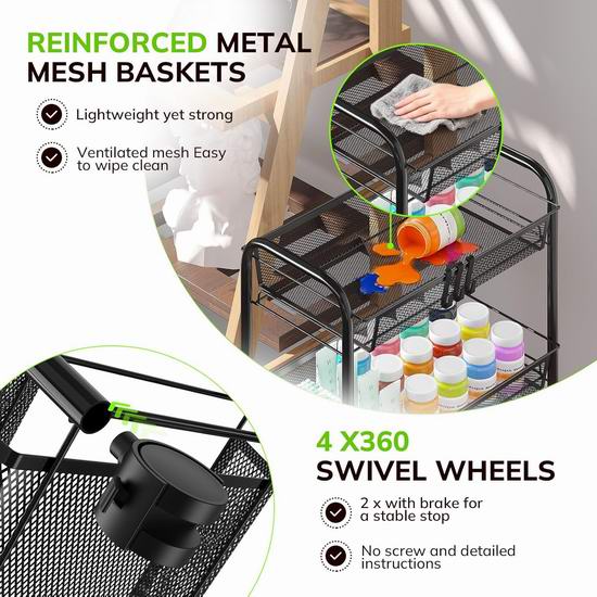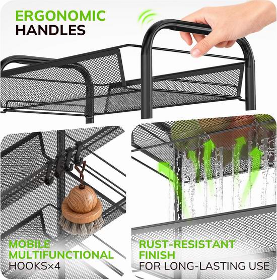 这款推车采用商用级加厚钢架结构,涂有三层防锈涂层,即使在潮湿的厨房中也能抵抗腐蚀。符合人体工程学的管状推杆,光滑不易变形,在100磅的负载下仍能保持刚性,且不会刮伤地板。配备5厘米深的编织网状屏障,同时形成交叉通风通道,快速蒸发水分,每层可承重34磅。内置4个滚轮,其中2个可锁定。