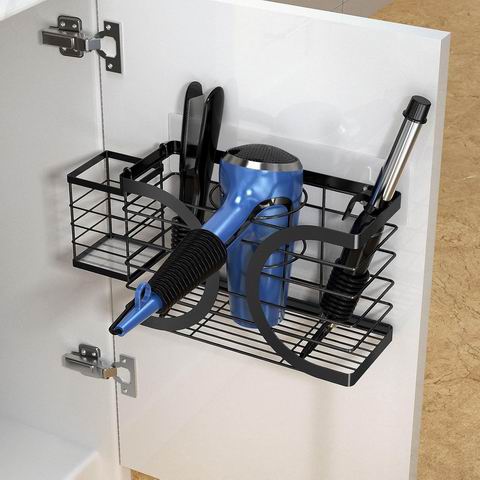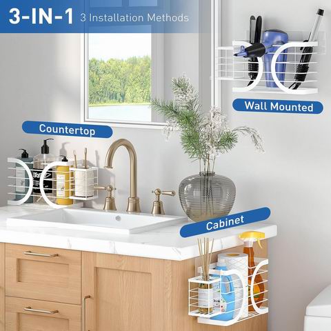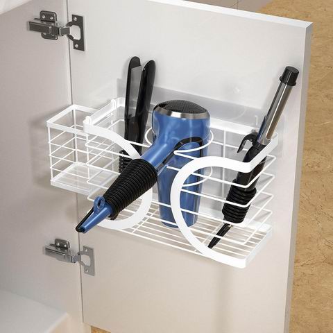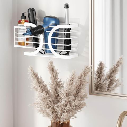 采用防锈金属材质打造,提供壁挂与台面两种安装方式,配备专用吹风机孔、多层置物架及耐热储物篮,可安全收纳高温吹风机、卷发棒等工具,适用于浴室、卧室等多种家居场景。