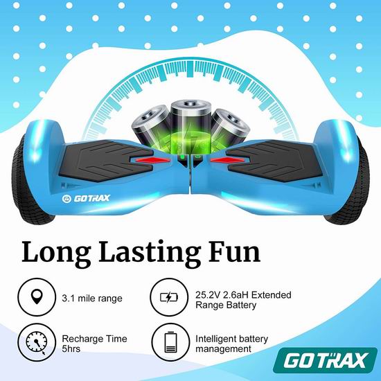 此款智能平衡车通过了美国迄今最严苛的UL2272认证,安全可靠。内置两个200W无刷电机,6.5英寸实心橡胶轮胎,最高时速为每小时10公里,自动平衡控制,内置LED照明灯,最大载重176磅,最低载重44磅。配备25.2V 2.6Ah大容量锂电池,充电5小时,可续航5公里。
