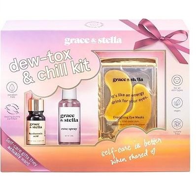 grace & stella “Dew-Tox & Chill” 护肤礼盒是一套适合送礼与旅行携带的纯素护肤组合,内含黄金眼膜 5 对、10ml 玻尿酸补水精华和 30ml 玫瑰水喷雾,主打快速补水提亮、缓解干燥并淡化细纹,同时通过眼膜改善黑眼圈与眼袋、唤醒疲惫双眼;配方温和、零残忍适合多种肤质,外包装精美,适合作为生日礼物、闺蜜/姐妹礼、单身派对伴手礼或日常自我护理套装。