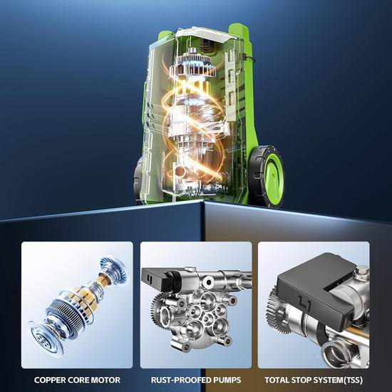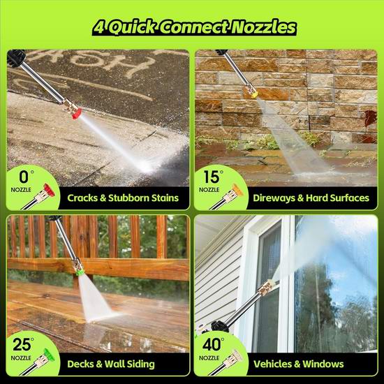 这款电动高压清洗机最大输出压力可达2500 PSI,流量可达2.4 GPM,清洁力强劲,可去除居家环境中的大部分污渍或污垢。配备4个快速连接金属喷嘴,适用于不同的应用场景,泡沫枪可填充洗车液、漂白剂和其他化学清洁剂,以提高清洁效率。配备23英尺长的软管,高压清洗机提供充足的长度,确保自由移动。内置TSS(完全停止系统),松开扳机时自动关闭。具有过载和过热保护装置,可更好地延长洗衣机的使用寿命。