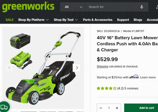 Greenworks 16英寸 40伏 充电式无绳割草机6.6折 349.99加元包邮!