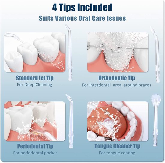 此款水牙线采用高频脉冲水流快速清洁牙齿和牙缝,具有3种冲洗模式(常规、温和、脉冲),3级压力选择,容水量高达280ml,配备4个喷嘴,满足不同清洁需要。无绳设计,内置锂电池,充满电后,可使用60天左右。