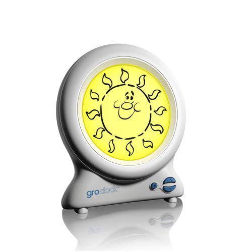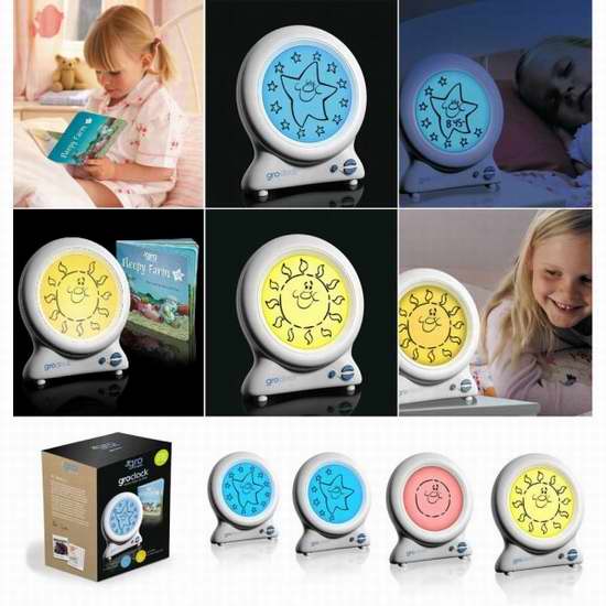 这是一款口碑很好的早教用品,可以教会宝宝晚上睡觉、早上起床。白天和夜晚分别显示太阳和月亮,家长可以设定调节宝宝的睡眠时间,到了晚上,钟表数字区域会有星星闪烁,一颗一颗的灭掉,告诉宝宝,星星也陪你一起睡觉啦。到早上灯光会由蓝紫 变黄橙色,太阳也会出现,这就是要起床的信号,但太阳没出现的时候你必须待在床上,从而帮助宝宝培养良好的睡眠习惯,颜色和形状的变化让宝宝意识到时间的变化。通过以上的训练,一阵子后宝宝就学会明白晚上自己入睡,早上醒来自己起床的逻辑。