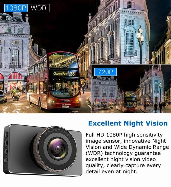 采用高性能传感器,170度广角镜头,1080P全高清,可夜视,自动循环无缝记录视频,前置镜头可以清晰捕捉6条车道的行车画面,屏幕可实时预览前或后摄像头拍摄画面(倒车时自动切换画面)。采用超级电容供电,可承受-30°C至75°C的极端环境温度,使用寿命更长。具有运动检测功能,最大支持64GB Micro SD闪存卡(请使用Class 10级别以上的闪存卡)。支持重力感应,当发生碰撞后,能即时的记录下这段视频,防止被覆盖掉。