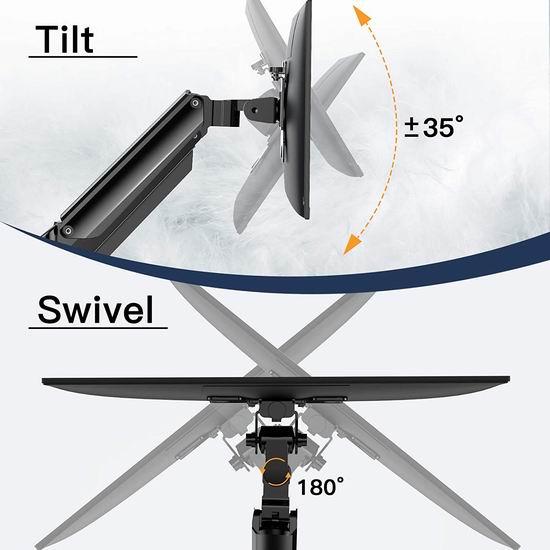 显示器旋臂支架可以让您拉动显示屏即可快速调整角度及位置,达至舒适、符合人体功效的位置。三段式旋臂左右转幅分别为-30° to +35°、180°、360°,旋臂可负重17.6磅或承托17-32英寸显示器或电视。