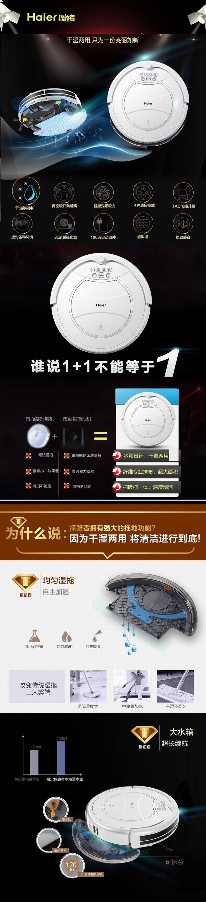 智能清扫,干湿两用,均匀湿拖,自主加湿,改变传统湿拖局部湿度大,中途频加水,干湿不均匀等弊端。120分钟超长续航,水箱蓄水量高达180ml,精密纤维抹布,强力干抹(钩形纹理,勾起地面尘螨浮灰所到之处光洁如新),倒钩式表层,水洗即可,清扫能力高达98%。
