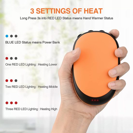 采用时尚椭圆造型,配备快速加热元件,3秒双面快速均匀加热,三挡温度(40-55℃)满足不同需求,不同温度档,分别最长可加热8/10/13-15小时。同时,还具有充电宝功能,配备充电口,可为手机补充电力。内置安全保护系统,避免出现过压、过充、过载、短路等情况。