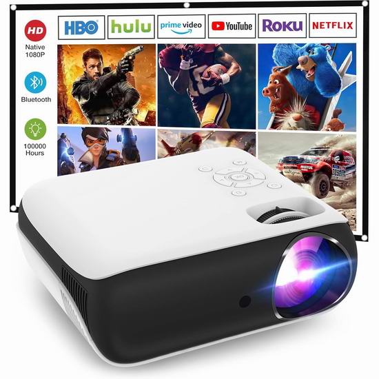 此款投影仪具有1080P物理分辨率,支持播放4K视频,亮度高达9500L,动态对比度10000:1,支持±15°梯形校正,通过调整与墙面距离(6.8-16.4英尺),可实现40-200英寸屏幕的投影。支持HDMI、AV、USB等多种输入方式,与Fire TV电视棒、Roku电视棒、笔记本电脑、游戏机、台式机、机顶盒、DVD播放器、摄像机、监视器等连接后播放电影、视频或游戏。内置HiFi立体声双外放喇叭及3.5mm音频输出插孔,支持蓝牙连接耳机或音箱播放。送100英寸投影幕布。
