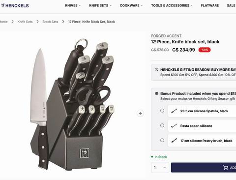 史低价!HENCKELS Forged Accent系列 高碳不锈钢厨房刀具12件套 112.47加元(官网原价 575加元)