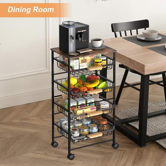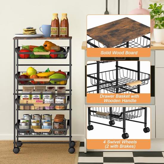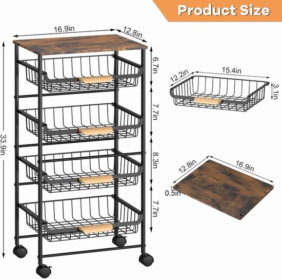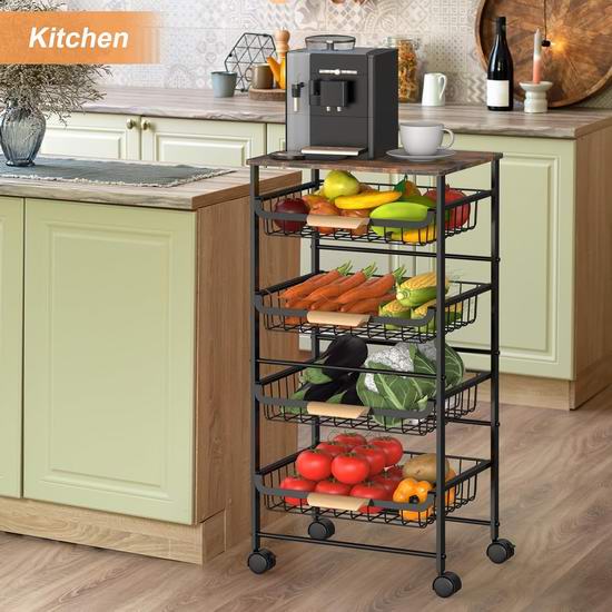 这款厨房推车收纳架采用优质金属结构,坚固耐用,经过防锈涂层处理,确保在潮湿环境中也能持久使用。配有木质台面和四个宽敞的金属网篮抽屉,提供充足的收纳空间,并促进空气流通,可存放蔬菜、水果、玩具、手工用品、化妆品、文具等。设有4个可锁定万向轮,方便移动。外形尺寸为32.5 x 43 x 86厘米。