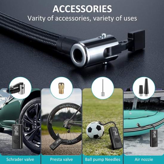 这款充气泵,内置高性能泵芯,最高150PSI压力和30L/min气流,充气速度快2倍。顶部配有LED灯,方便夜间使用,并具备C型充电端口和5V/2A USB输出,可充当应急电源。支持4种单位(PSI、BAR、KPA、KG/M²),提供汽车、自行车、球类和皮划艇4种预设模式,另有自定义模式满足特殊需求。双屏显示实时压力和预设值,充气完成自动停止,防止过充,安全精准。LED灯可用于夜间照明或警示,实用性强。无绳设计小巧轻便,配储物袋,便于随身携带,适用于汽车、自行车或户外活动。
