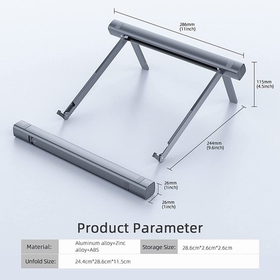 此款支架采用轻质铝合金+ABS材质,轻巧耐用,便于携带,可快速打开和折叠,折叠后非常小巧,仅重0.6磅,符合人体工学设计,通过调节笔记本电脑的观看角度(角度可调),避免不当姿势造成的颈部手部疲劳和疼痛,并有助于笔记本散热。可用于放置11-17.3英寸笔记本电脑和平板电脑。