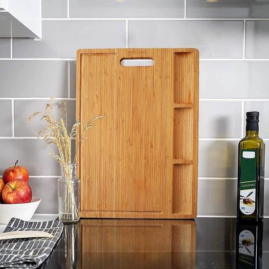 采用100%天然有机毛竹制成,环保绿色健康,不含BPA,抛光处理,不易翘曲或开裂,经久耐用,环形导水槽设计,防止切菜时的汁水流到台面,内置3个凹槽,可用于暂时放置切好的食材。尺寸分别为43.2 x 32 x 1.8厘米、43.5 x 34 x 1.8厘米。