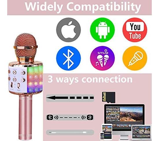 打破传统卡拉OK设备的限制,没有场地的限制,不需任何音源输出设备,带给您前所未有的炫酷的K歌体验,让您走到哪唱到哪。360°立体声扬声器,三层网状滤波器,减少噪音,音质卓越,支持micro SD卡播放音乐,支持蓝牙连接手机、平板或电脑播放音乐,具有原声、童声、女声、男声、怪兽声等变声模式,内置炫酷七彩变色灯光。内置锂电,续航时间可长达4-10小时,兼容大多数音乐App软件和YouTube等。