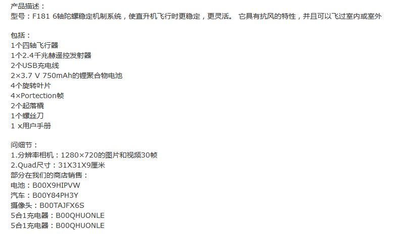 本飞行器并非普通玩具,它除了在室内外均可飞行,相机分辨率:1280×720的图片和视频30帧,可以录像和实时传输功能,通过遥控,配备了最新的6轴飞行控制系统(3陀螺仪和加速度计3),一体化设计,保证该机的精确定位,稳定性强,轻松实现各种航班起降,抗风能力强;配备4通道2.4GHz的智能系统,操作简单,一键返回;具有360度全方位3D翻滚特技功能(可连续翻滚)可上升/下降/前进/后退/左右侧飞,无头模式等全比例操作功能,范围:约50-100米。 电池运行时间:约7-9分钟。 充电时间:约100分钟