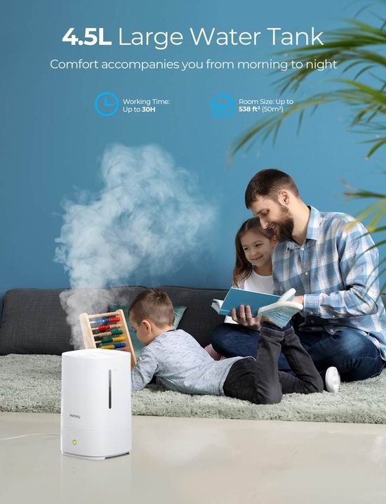 此款加湿器具有4.5升大容量,28分贝极低噪音运行,不会影响睡眠,三级雾化强度可调,一次加水,可持续工作30小时,一旦水用完它会亮起红灯并自动关闭,安全可靠。箱体采用抗菌材料,可杀灭水中细菌。360度可旋转喷嘴散发出的超精细冷雾,为您提供清爽的空气,同时通过提供水分,保护您的皮肤。可在喷嘴中加入香薰精油,随着冷雾散发香味。