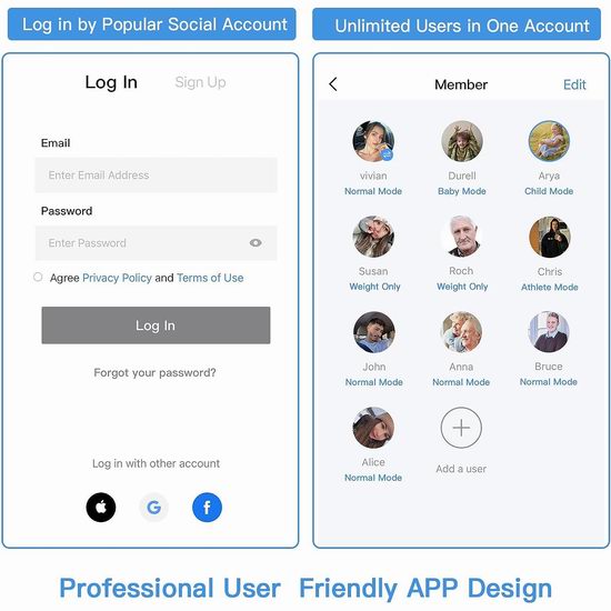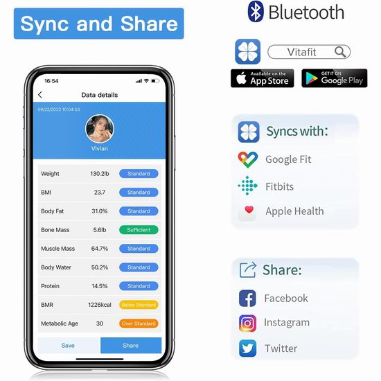 健康不仅取决于你的体重。无论你想减肥还是保持体型和健身,体重不是唯一需要关注的因素。你应该更加注意你的身体脂肪,水分和肌肉质量。这款智能体重秤采用蓝牙技术,与最热门的健身类App兼容并同步数据,如Vitafit、APPLE HEALTH、GOOGLE FIT,测量并储存体重,身体水分,脂肪含量,BMI,BMR,肌肉质量,骨质含量,内脏脂肪含量等数据,以便追踪记录数据。最高可承受400磅的体重,大屏幕液晶显示,自动校准。