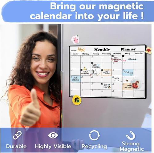轻松书写,轻松擦除:冰箱日历由优质PVC和PET材料制成,易于擦拭且无重影,适合多次重复使用。可轻松粘在任何金属光滑表面,非常适合冰箱或办公室文件柜。