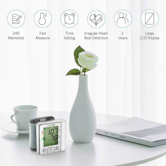 此款血压计通过FDA认证,一键操作,全自动测量血压和心跳速率,可检测心律失常和心房颤动,可储存2 x 120组数据,2.4英寸高清易读大屏幕,紧凑型设计,方便随身携带。
