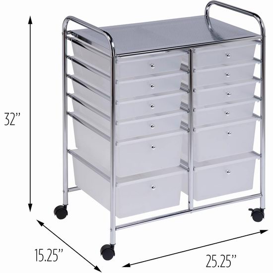 采用不锈钢镀铬框架结构,共有12组半透明抽屉,配有可锁定万向轮,顶部为不锈钢网面遮挡,可用于收纳文件、工具、玩具及杂物等,适合家中、办公室及车库使用,设计紧凑,可置于办公桌下。外形尺寸为38.1D x 63.5W x 81.3H厘米。