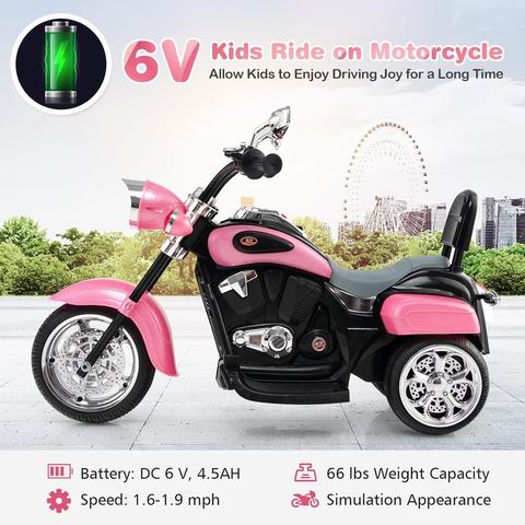 采用 6V 电池驱动与稳定三轮设计,适合 3 岁以上男孩女孩骑乘,在保障安全的同时帮助锻炼平衡能力。车辆配备前灯、喇叭、后视镜、脚踏板及前进/后退按钮,模拟真实骑行体验,运行平稳安静,兼具娱乐与启蒙功能。整车采用环保 PP 材质与高强度铁架结构,座椅贴合儿童体型,舒适耐用,是生日或节日送给孩子的理想电动骑乘玩具。