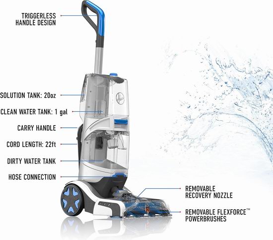 是一款高效易用的全尺寸地毯清洗机,具备自动清洁技术,推前清洁、拉回干燥,自动混合功能精准调配清洁剂,确保最佳清洁效果。22英尺电源线、20盎司清洁剂容量,配有FlexForce强力刷头,轻柔去除深层污垢和宠物脏物,一步可拆卸喷嘴便于清洁刷头。双水箱系统设计方便注水、倒水和清洗,免扳机设计使地毯清洁如同吸尘一般简单。自动干燥功能利用HeatForce技术加速干燥过程,节省时间。配备2合1抗菌宠物工具和低轮廓底座,便于清洁角落和去除污渍,适用于地毯、楼梯、沙发及车内等多个位置,强力去除顽固污渍和宠物脏物,让地毯清洁变得轻松且高效。