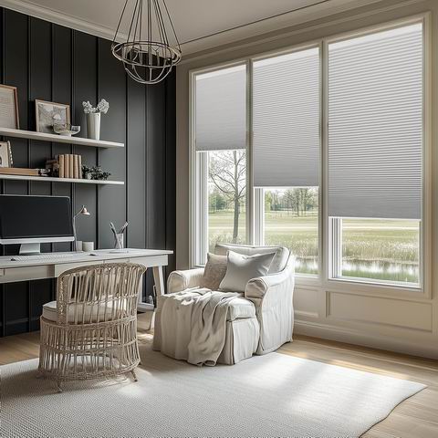 • 完美遮光隔热:采用100%遮光无纺布与隔热蜂窝结构,正反面颜色一致,同色顶底轨,兼具降噪、防紫外线、防尘功能,冬夏皆有助于保持室内温度。