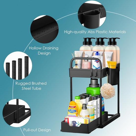 节省空间且整齐有序,双层设计可帮助您在同一空间存储更多物品,底部滑出式抽屉设计,可容纳洗碗液、洗发水、沐浴露、化妆品等。配有2个挂杯和8个挂钩。 用于悬挂小东西的挂钩,用于放置刷子或小东西的挂杯。适用于厨柜、浴室、壁橱、洗衣房、食品储藏室和其他适用的地方。