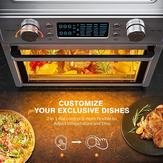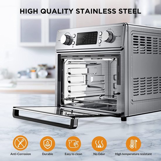 此款智能对流空气炸锅具有 26.3 QT超大容量,预设24种一键烹饪程序,内置LED背光显示屏,数字温度控制,360°热空气循环加热,烹饪时更快更均匀,简单易用。通过高速、均匀地循环热空气,很快加热和脆化食物表面,达到油炸食品般的外焦里嫩口感。与传统烤箱相比,可以排出高达80%的油脂并且更加美味又健康。满口香酥,却不用摄入普通油炸食品的大油量和卡路里。吃得美味无负担!配备烤盘、空气炸烤蓝、烤架、干果蓝等多个烧烤配件,可用于烤鸡鸭、烤羊肉串、烤薯条、烤鱼、烤面包、烤披萨、烤肉、食物烘干脱水等。最高烘培温度450℉/ 230℃。 内置计时器,钟声将响起,Airfry烤箱将关闭电源。