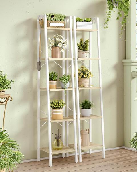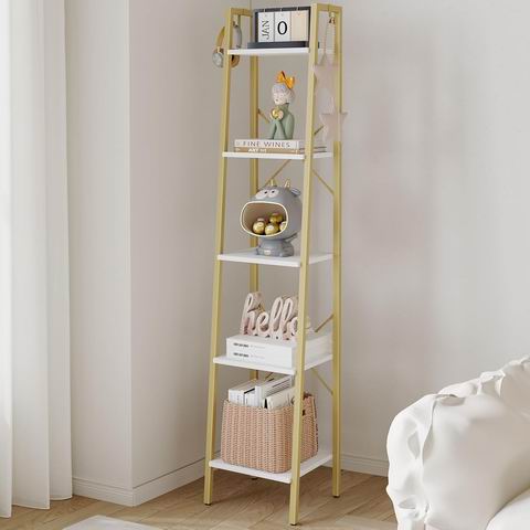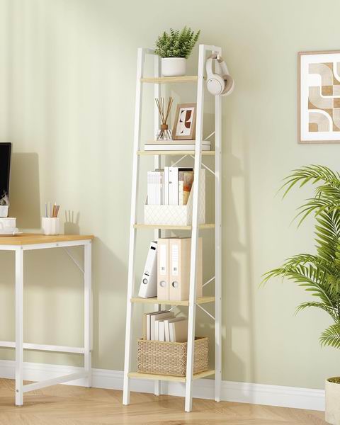 采用白橡木色与白色层板搭配工业风梯形设计,五层结构可用于摆放书籍、绿植、饰品或厨具,并附带 2 个挂钩方便悬挂钥匙或包包;窄型独立式设计节省空间,适合客厅、卧室、厨房或家庭办公室使用。尺寸大小:11.8″深 × 13.4″宽 × 63″高,稳固框架结合 X 型加固杆提升稳定性,单层承重约 30 磅,层板为 FSC 认证木材,结构简单、编号清晰,便于快速组装。