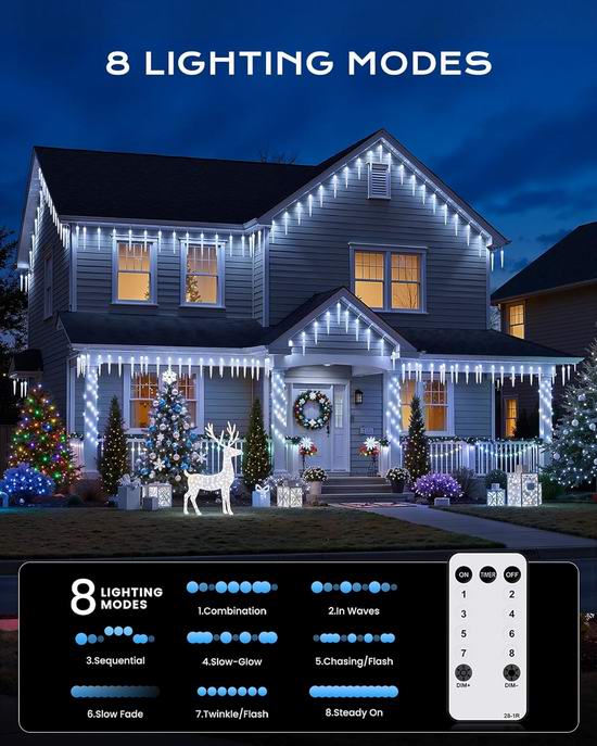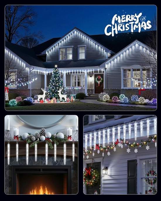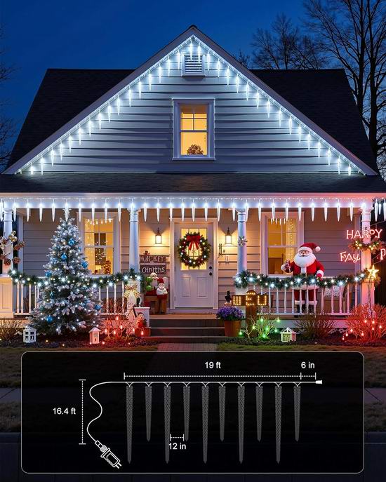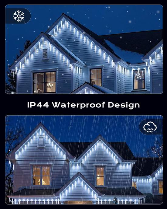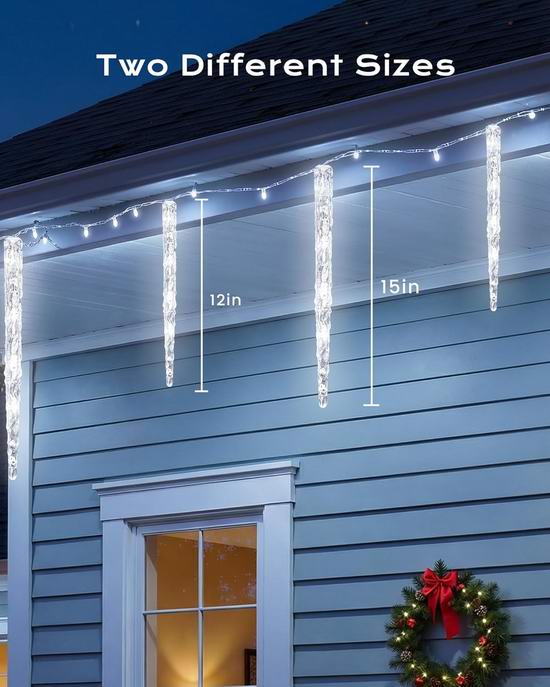 经典的冰晶设计,有两种不同尺寸冰柱灯管(15英寸和12英寸),共20根灯管,每个灯管内置100个闪烁的LED灯,增添视觉享受,在您的家中或院子里营造出令人惊叹的冬季仙境。总长29.42英尺,包括12.5英尺的灯串长度、16.4英尺的电源线和6英寸的末端线。配备遥控器,可以进行自定义设置,并且可以轻松地将最多6套首尾相连。IP44级防水,只要对插头进行适当保护,即可在户外使用。
