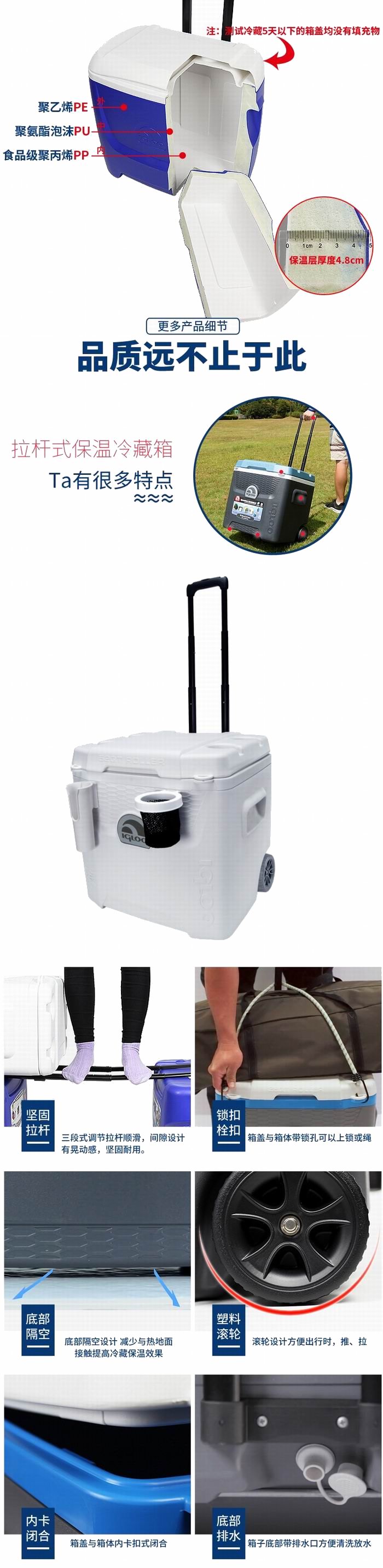 箱盖卡扣式闭合,配备锁扣,可以上锁或绳子密封,底部隔空设计,减少与地面的热交换,提升保温效果,箱底带排水孔,方便清洗放水。底部滚轮设计,方便推拉,三段式调节拉杆,非常坚固。