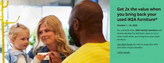 IKEA的家具回购计划(Sell-back program)去年就收到了超过13,000份成功申请。10月1日至31日期间,IKEA Family会员在网上提交符合条件的旧家具申请,并经门店审核通过后,将获得双倍店内积分返利。点击进入申请页面。