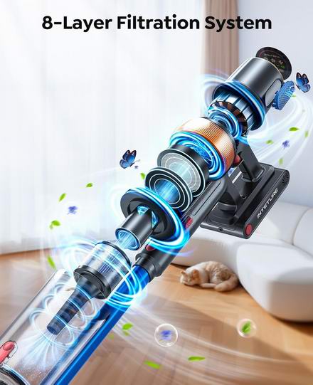 这款无绳吸尘器搭载600W电机,拥有50KPa吸力,吸力非常强劲,具有4档吸力模式,LED屏幕实时显示电池电量和当前吸力模式,能有效吸除深嵌于高绒地毯、小地毯和硬地板上的宠物毛发、灰尘和碎屑。配备的V型刷头,可轻松滑过宠物毛发和长毛,不易打结。专属的床垫刷头,可深度清洁床铺和沙发,去除宠物睡眠区域隐藏的灰尘和过敏原。内置高容量电池,最长续航可达65分钟,壁挂式充电设计,使用后挂起即可自动充电。