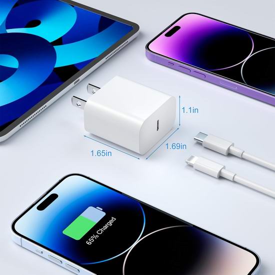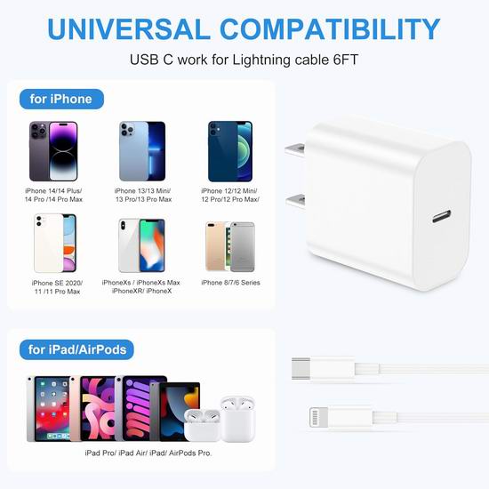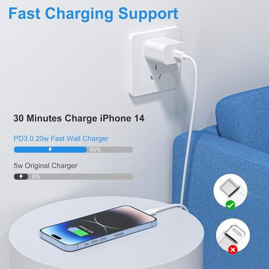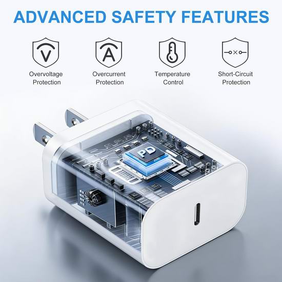 这款充电器支持PD 3.0和QC 3.0快充,最大输出功率 20W,采用原装苹果芯片,通过MFi认证,确保与苹果设备100%完美兼容,不会触发警告信息。内置多重保护系统,避免过压、过充、过热等问题。配备6英尺 Type-C 转 Lightning 数据线。