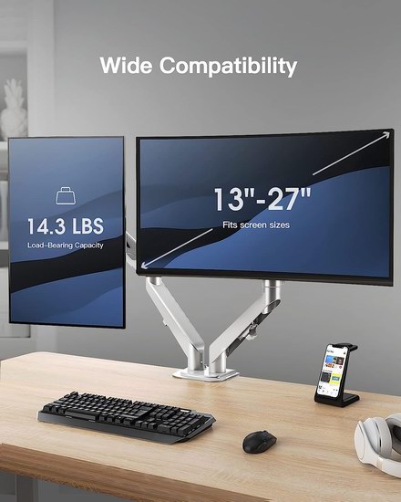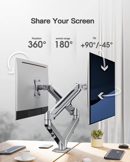 双显示器旋臂支架可以让您通过安装第二个液晶显示器,来体验两个显示器的加倍优势。拉动显示屏即可快速调整角度及位置,达至舒适、符合人体功效的位置。三段式旋臂左右转幅分别为+90°/-45°°、180°、360°,每支旋臂可负重3.3-14.3磅或承托17-27英寸显示器。支持夹式无损安装和转孔安装两种安装方式。