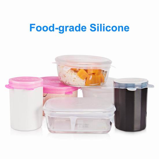 采用弹力有机硅胶材质制成,食品级环保无毒,不含BPA,可以重复使用,具有弹性,可密封各种大小和形状的容器、水果,保持食材新鲜。还可以套在瓶盖上,防止拧瓶盖时打滑。微波炉、烤箱、洗碗机、冰箱安全,可承受高温低温,可水洗和水煮。耐温范围:-40°C至220°C。