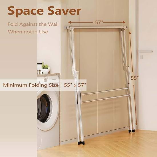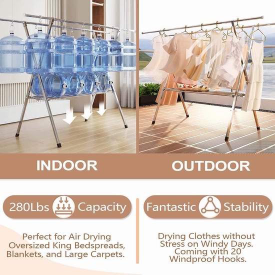 这款晾衣架选用重型不锈钢材质制成,简洁大方,坚固耐用。您可以根据需要调整长度(57-84英寸),足够容纳大量衣物,还可用于悬挂被子、床单、床罩、毯子、大毛巾等,不用时可以折叠靠墙放置。送20个防风挂钩。最大承重高达280磅。