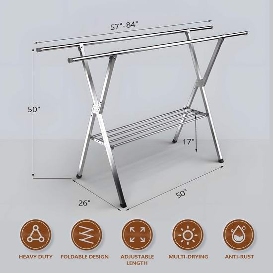 历史新低!JAUREE 2.13米重型不锈钢 可伸缩晾衣架5折 42.99加元包邮!送20个防风挂钩!